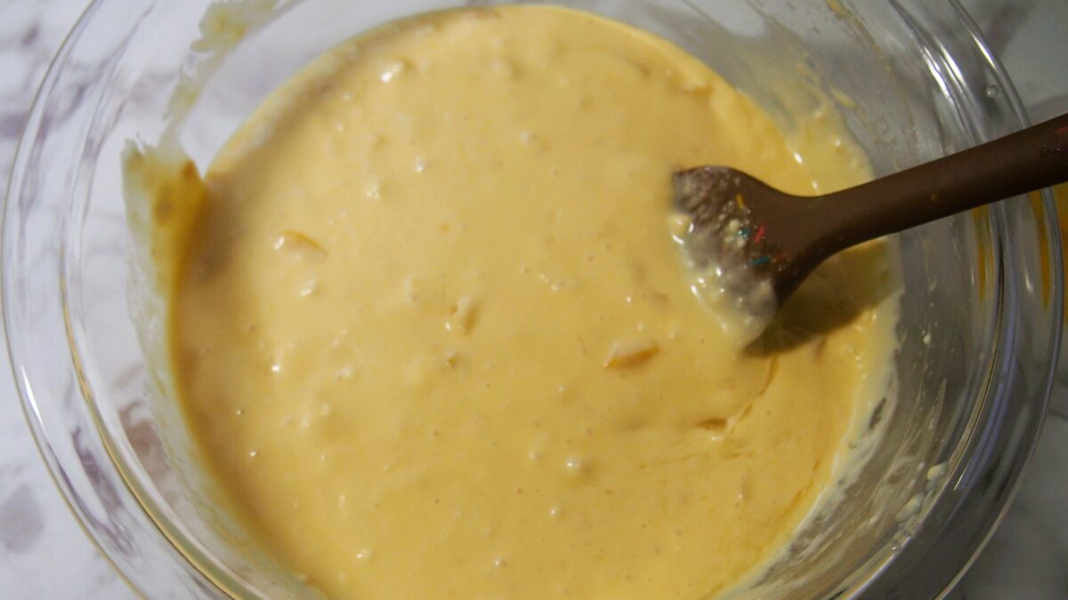 (泡立て器やゴムべらで軽めでいい) - 1.にサラダ油・溶かしたマーガリンを入れて混ぜる。