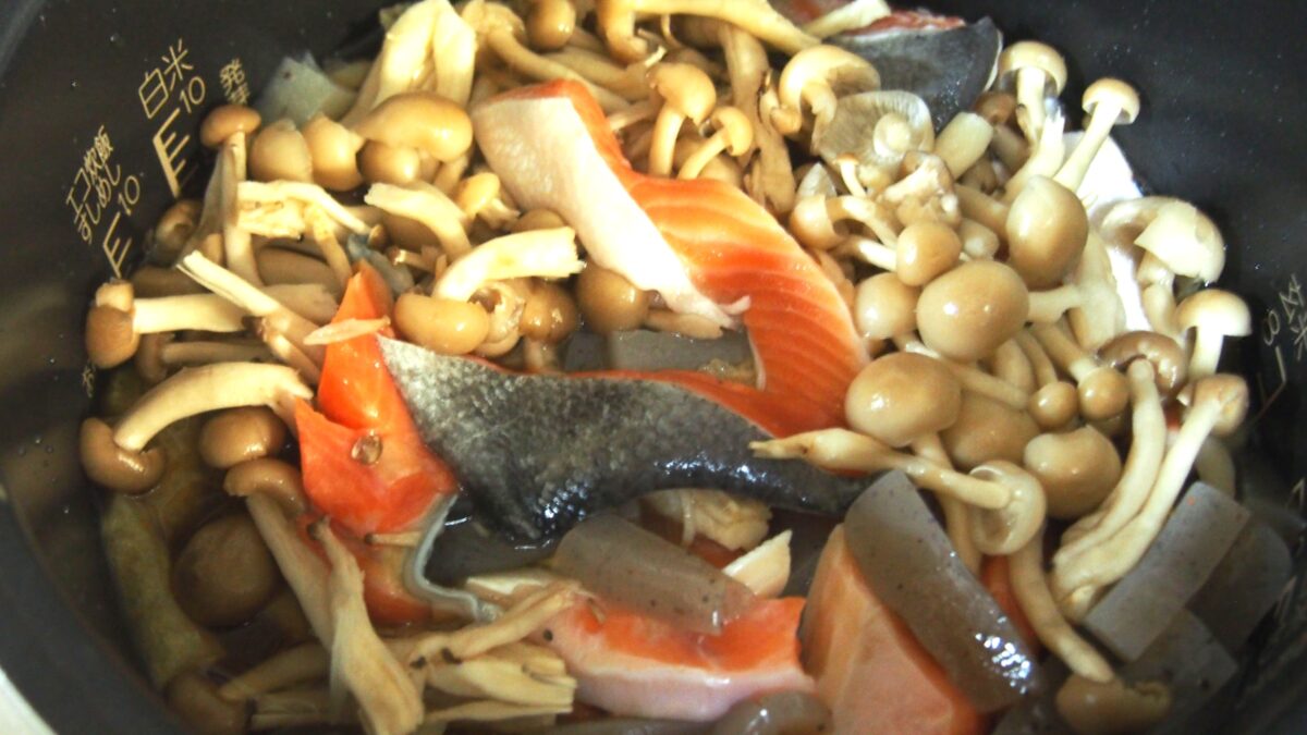 - 調味料を入れ、水を設定まで加え、具を乗せていつもどおり炊飯する。
