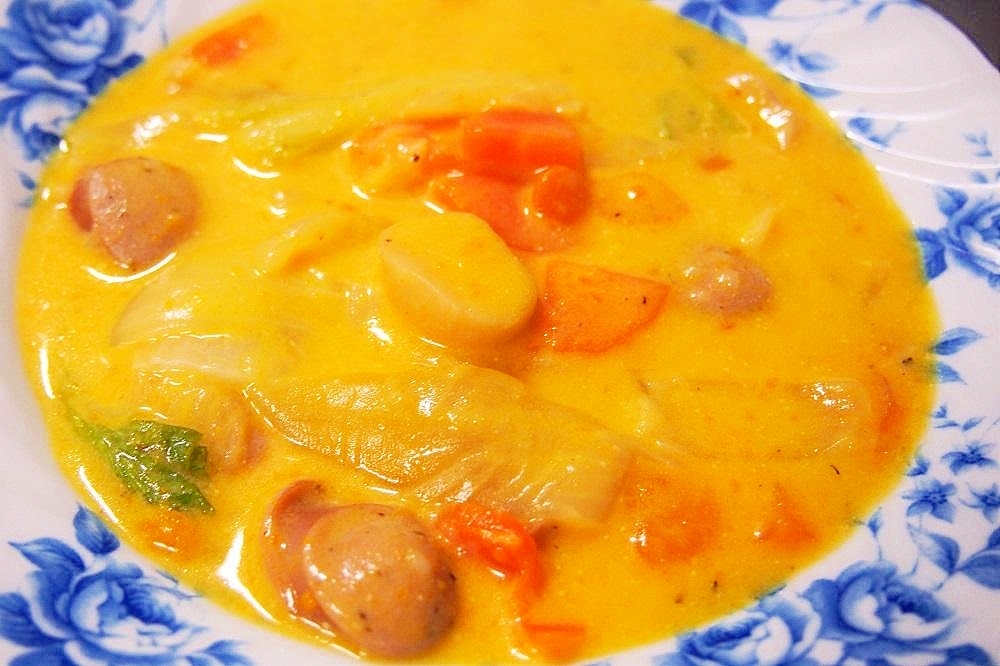 白菜の葉、にんじん、かぼちゃ、ウインナーなど、カラフルな色合いが楽しいメニューです。赤を入れるならパプリカ、ブロッコリーの濃い緑を入れてもクリスマス感UPです。